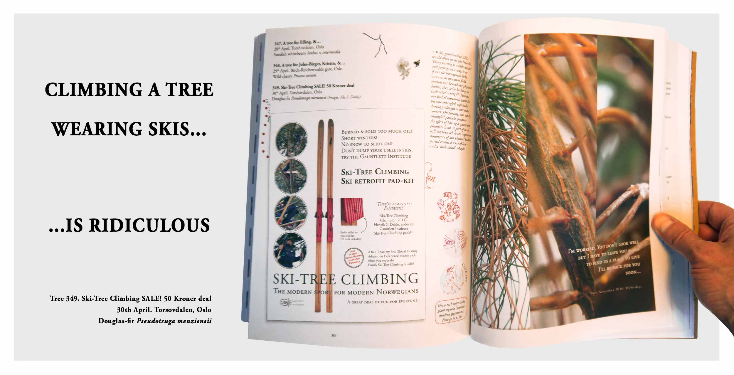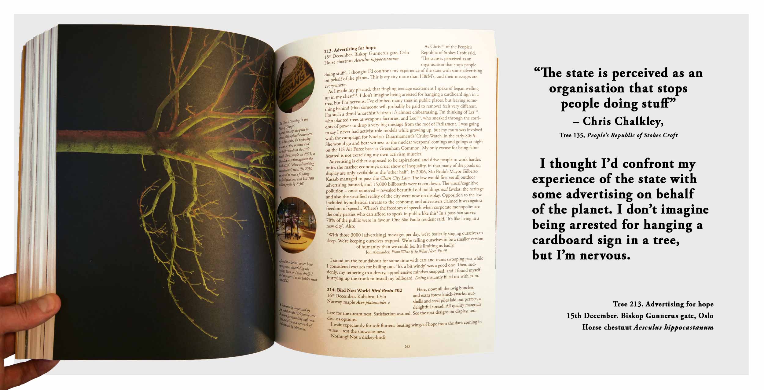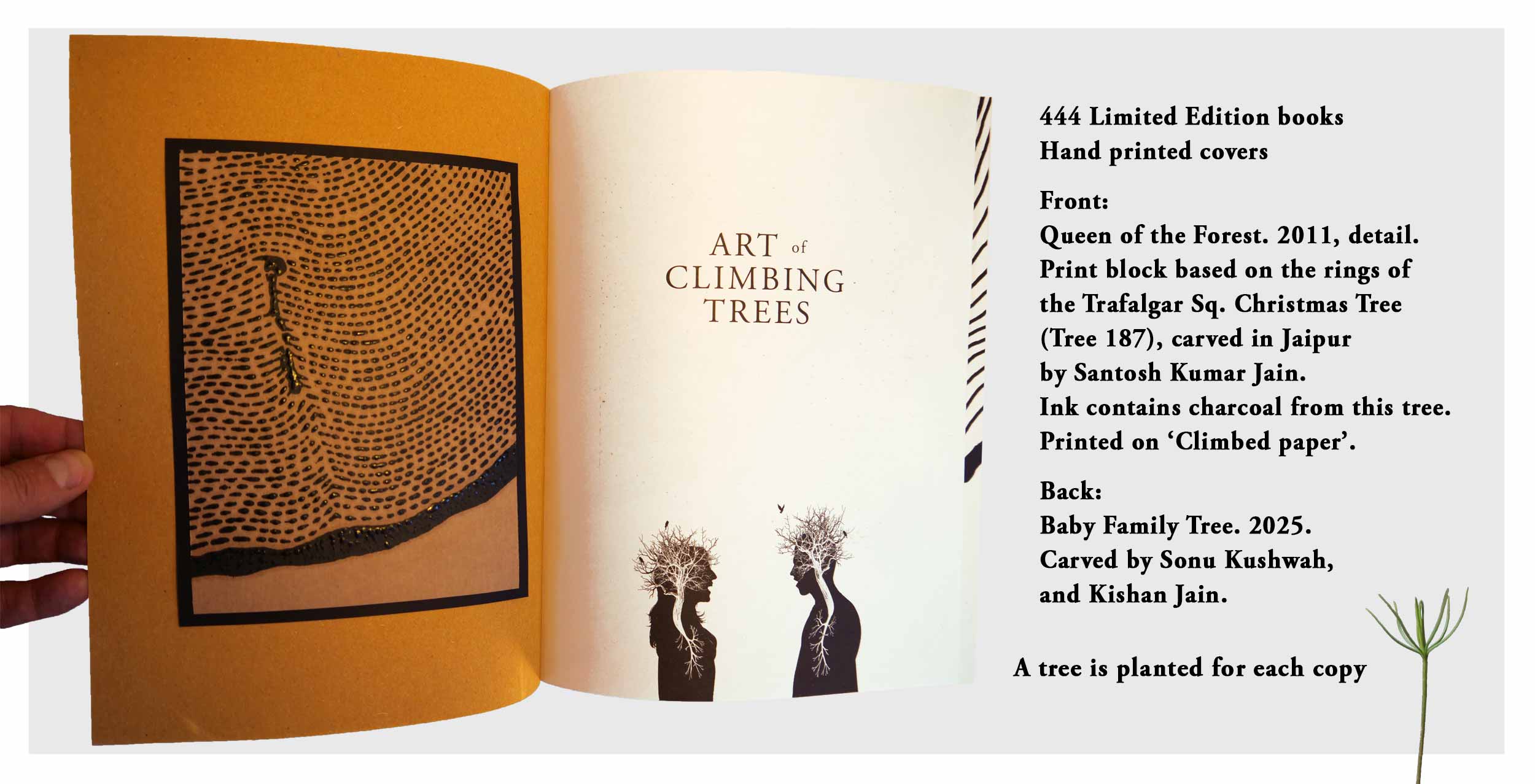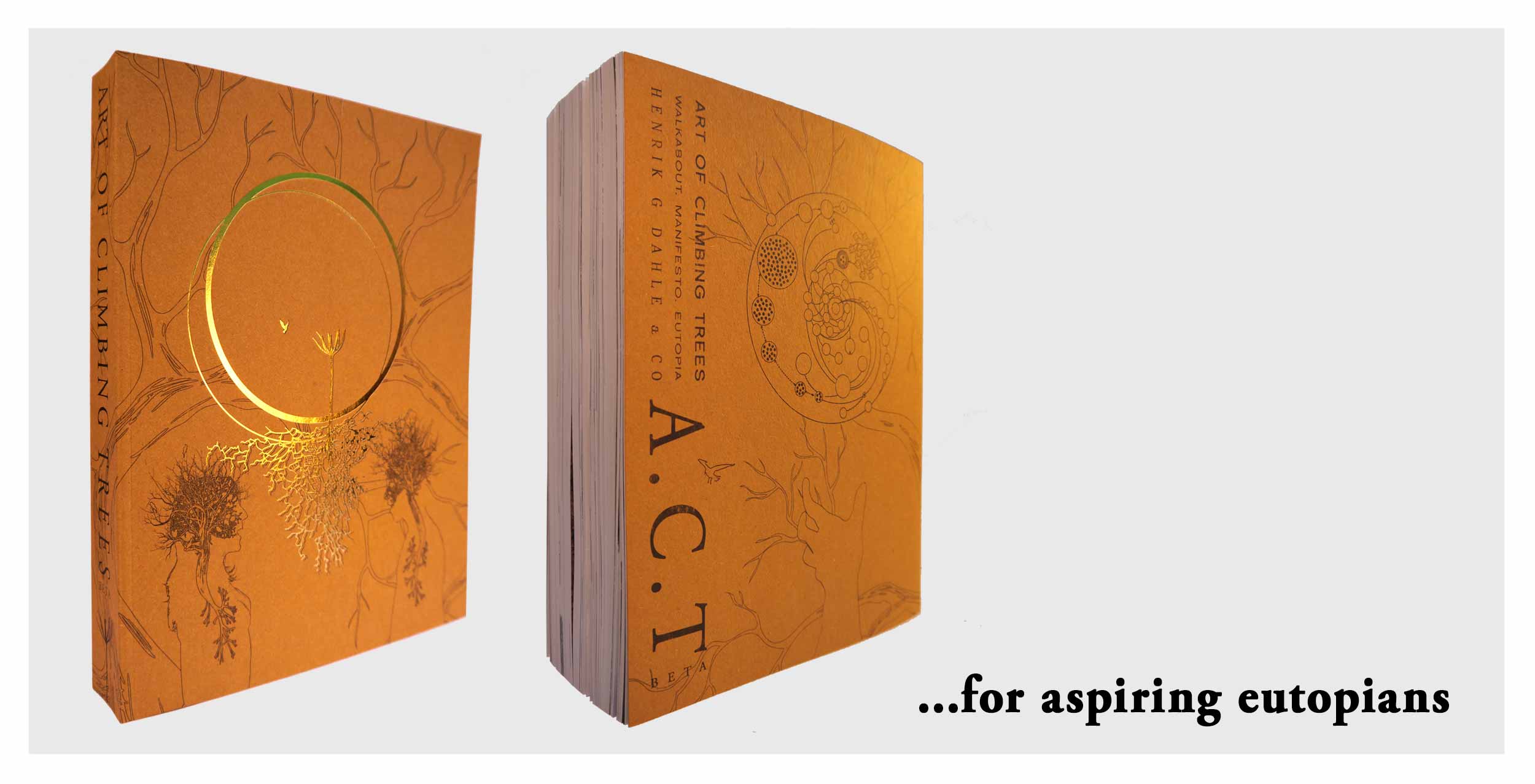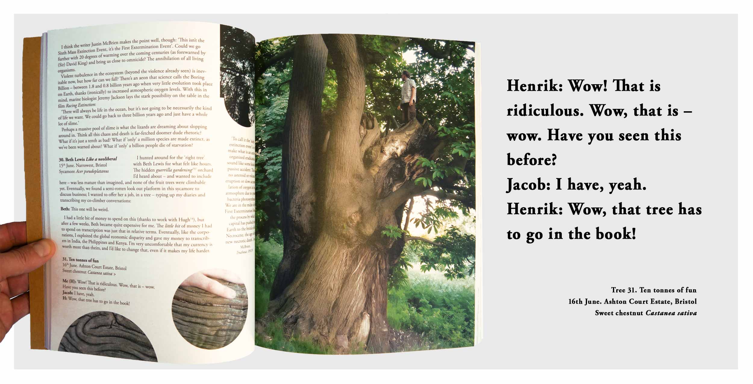…And, this book is a radical creative antidote, as reflected by the quiet explosion of trees. Art of Climbing Trees (A.C.T.), isn’t really about climbing trees, despite every page featuring my daily climbs for a year in extra/ordinary trees. Climbing trees is fun, challenging, and exhilarating however, and I recommend the simple encounter with nature. For me, they also gave a journey, a structure, and a reason to learn and pay closer attention; they gave me a place to play and provided the perfect strange and nostalgic setting for conversations, all culminating in a ‘Greenprint’ โ my suggestions for a transition to Eutopia, and how to break the cycle of violence, once and for all.