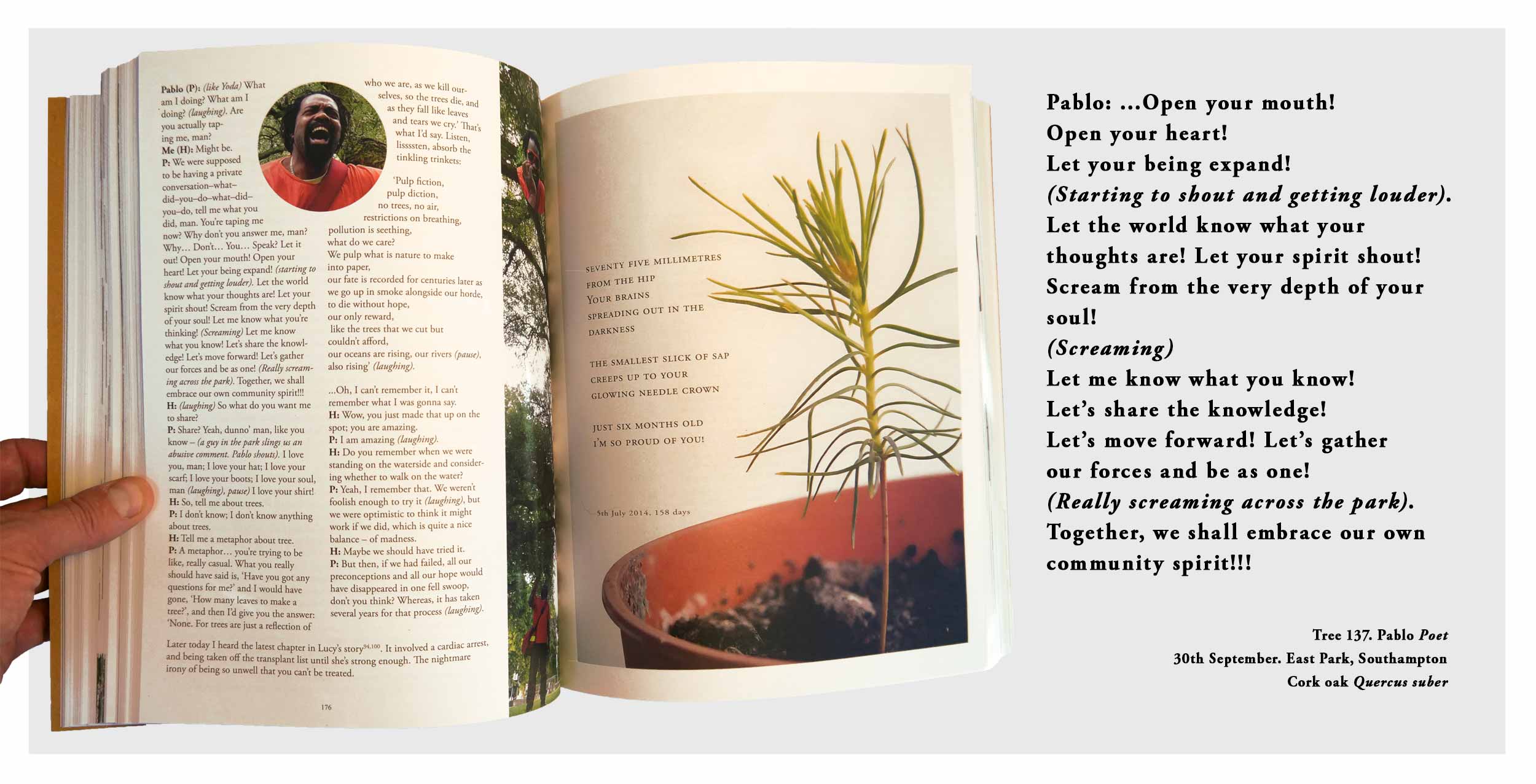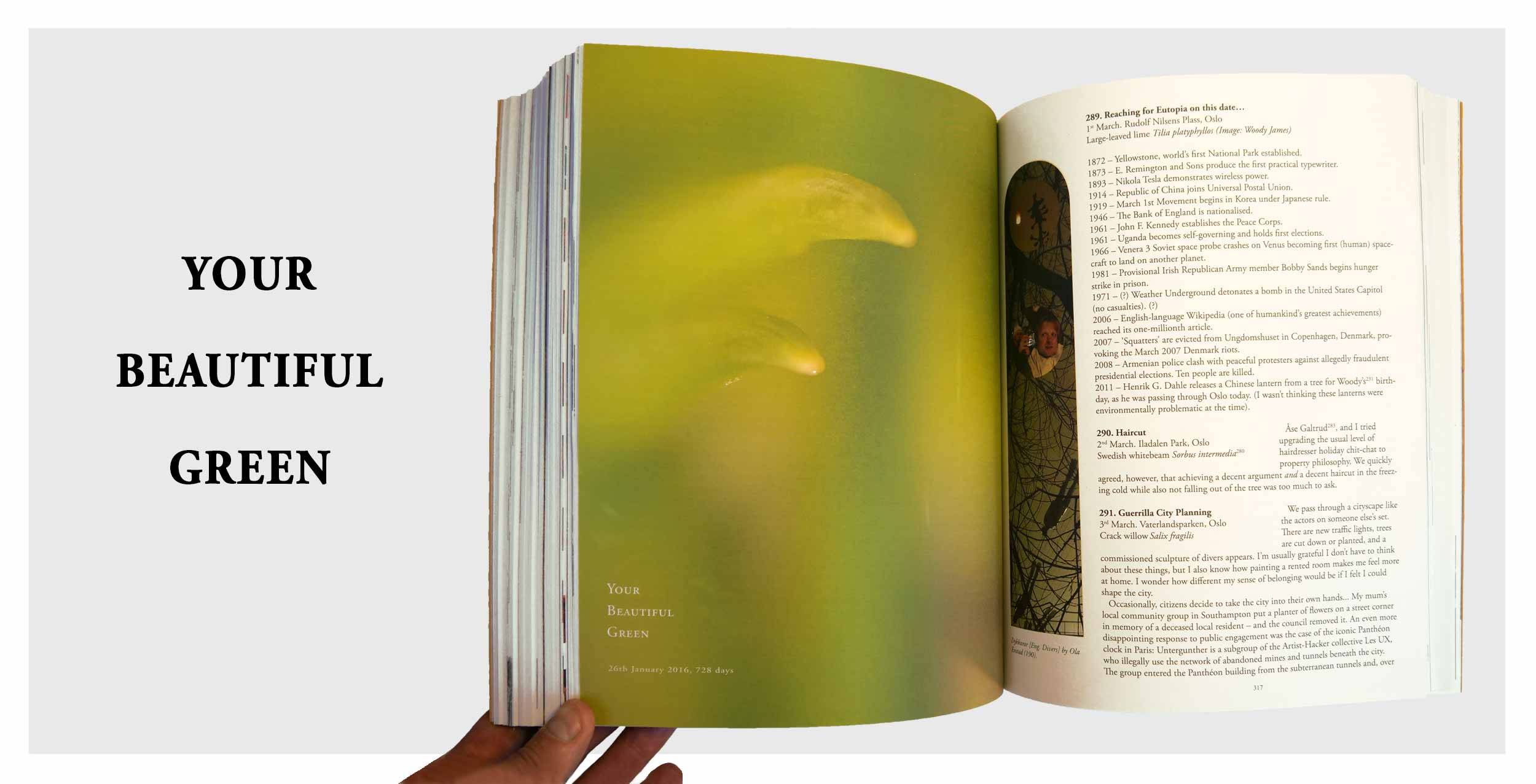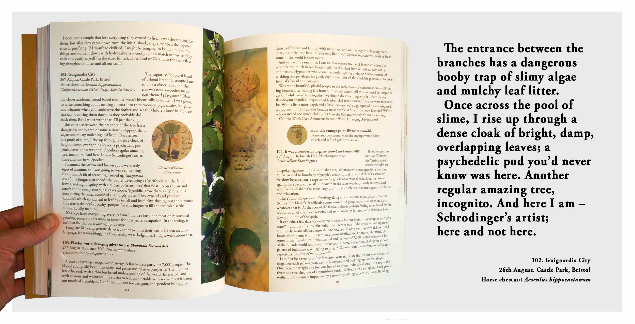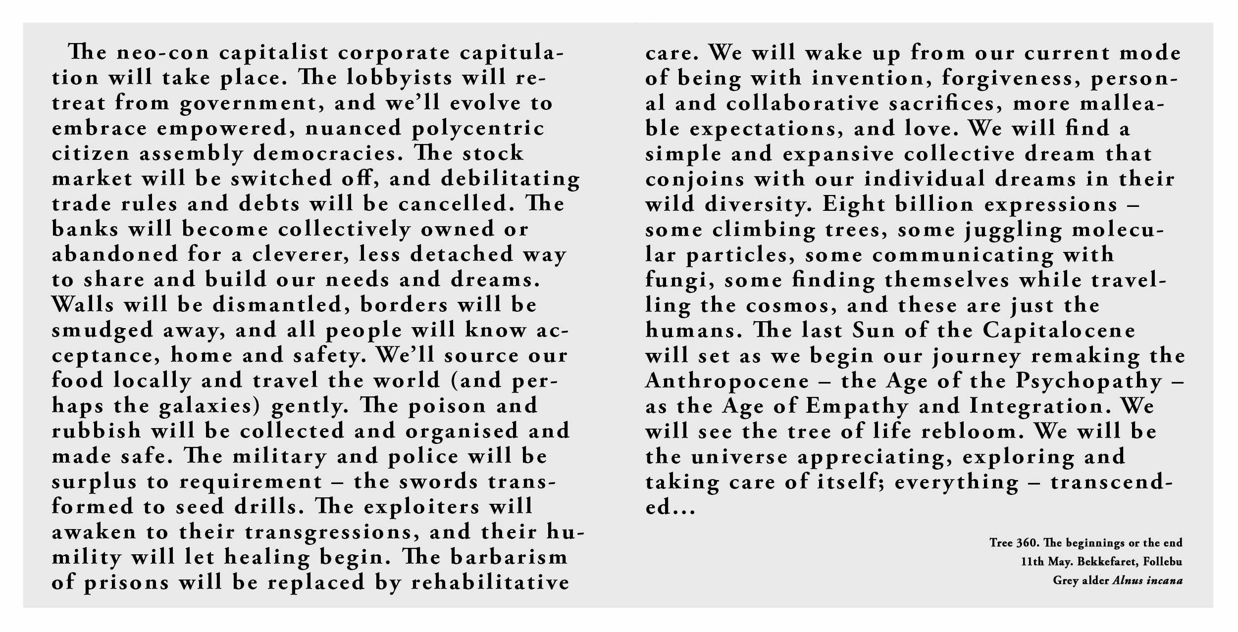 …And, this book is a radical creative antidote, as reflected by the quiet explosion of trees. Art of Climbing Trees (A.C.T.), isn’t really about climbing trees, despite every page featuring my daily climbs for a year in extra/ordinary trees. Climbing trees is fun, challenging, and exhilarating however, and I recommend the simple encounter with nature. For me, they also gave a journey, a structure, and a reason to learn and pay closer attention; they gave me a place to play and provided the perfect strange and nostalgic setting for conversations, all culminating in a ‘Greenprint’ โ my suggestions for a transition to Eutopia, and how to break the cycle of violence, once and for all.