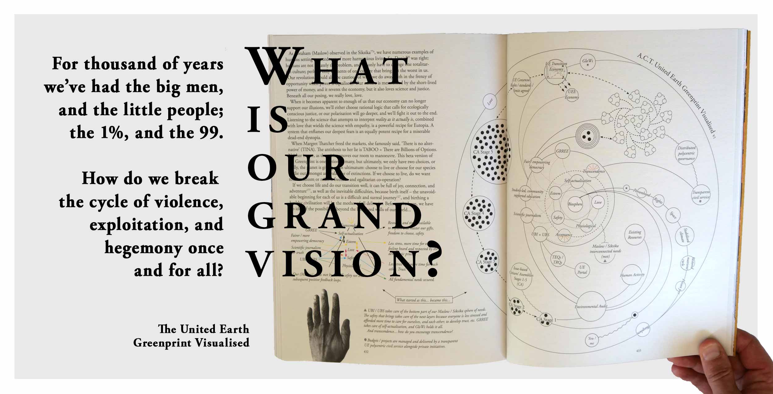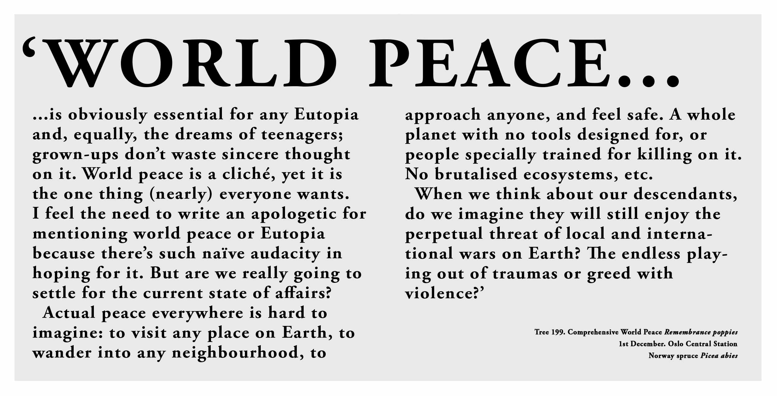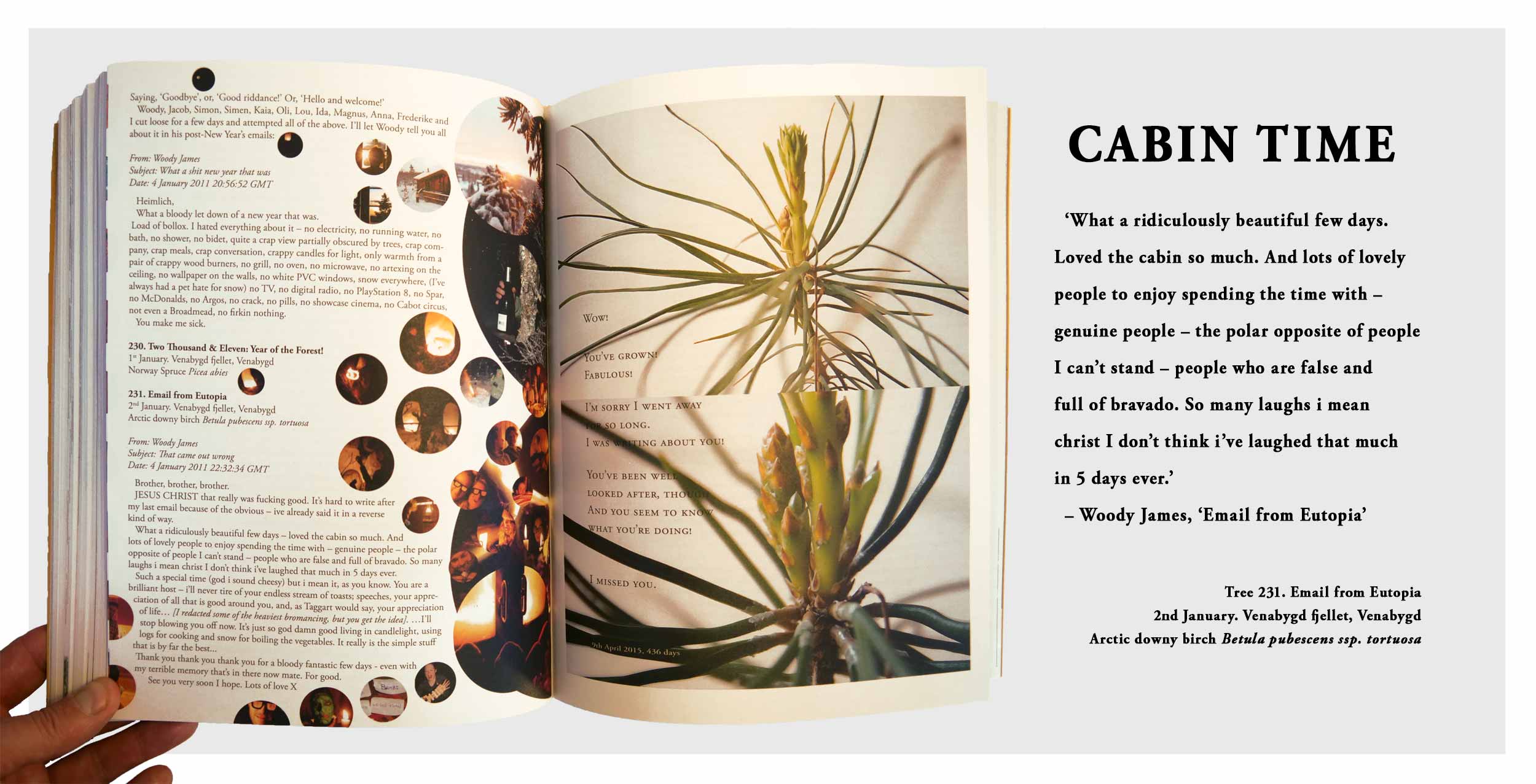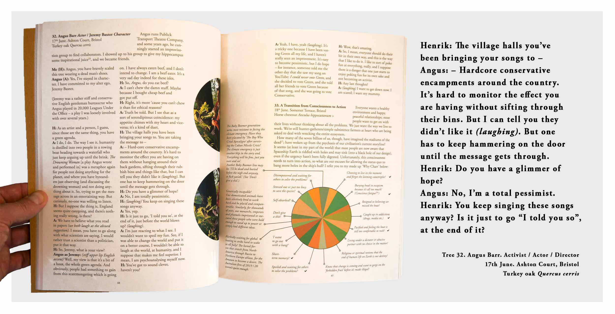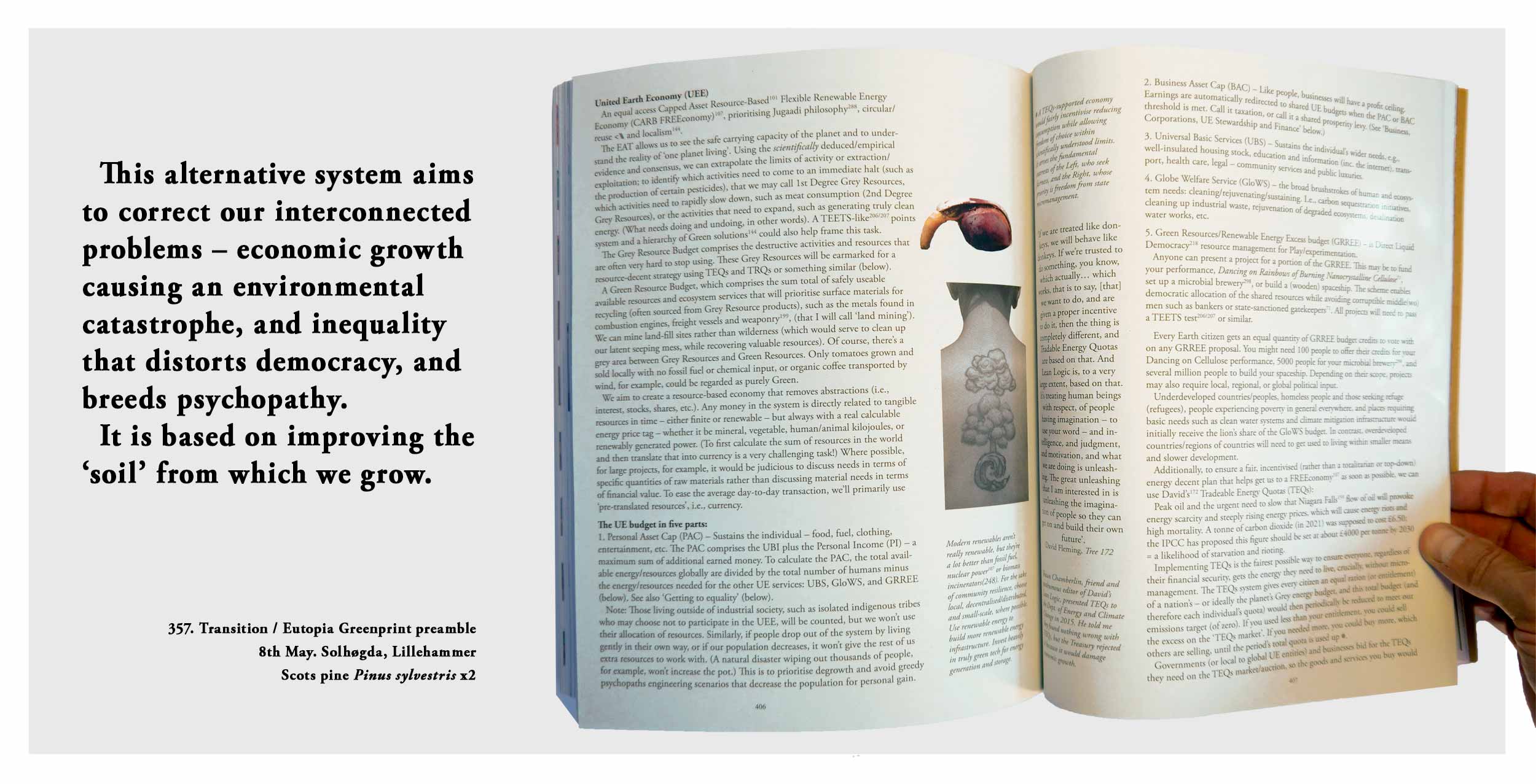 …And, this book is a radical creative antidote, as reflected by the quiet explosion of trees. Art of Climbing Trees (A.C.T.), isn’t really about climbing trees, despite every page featuring my daily climbs for a year in extra/ordinary trees. Climbing trees is fun, challenging, and exhilarating however, and I recommend the simple encounter with nature. For me, they also gave a journey, a structure, and a reason to learn and pay closer attention; they gave me a place to play and provided the perfect strange and nostalgic setting for conversations, all culminating in a ‘Greenprint’ โ my suggestions for a transition to Eutopia, and how to break the cycle of violence, once and for all.