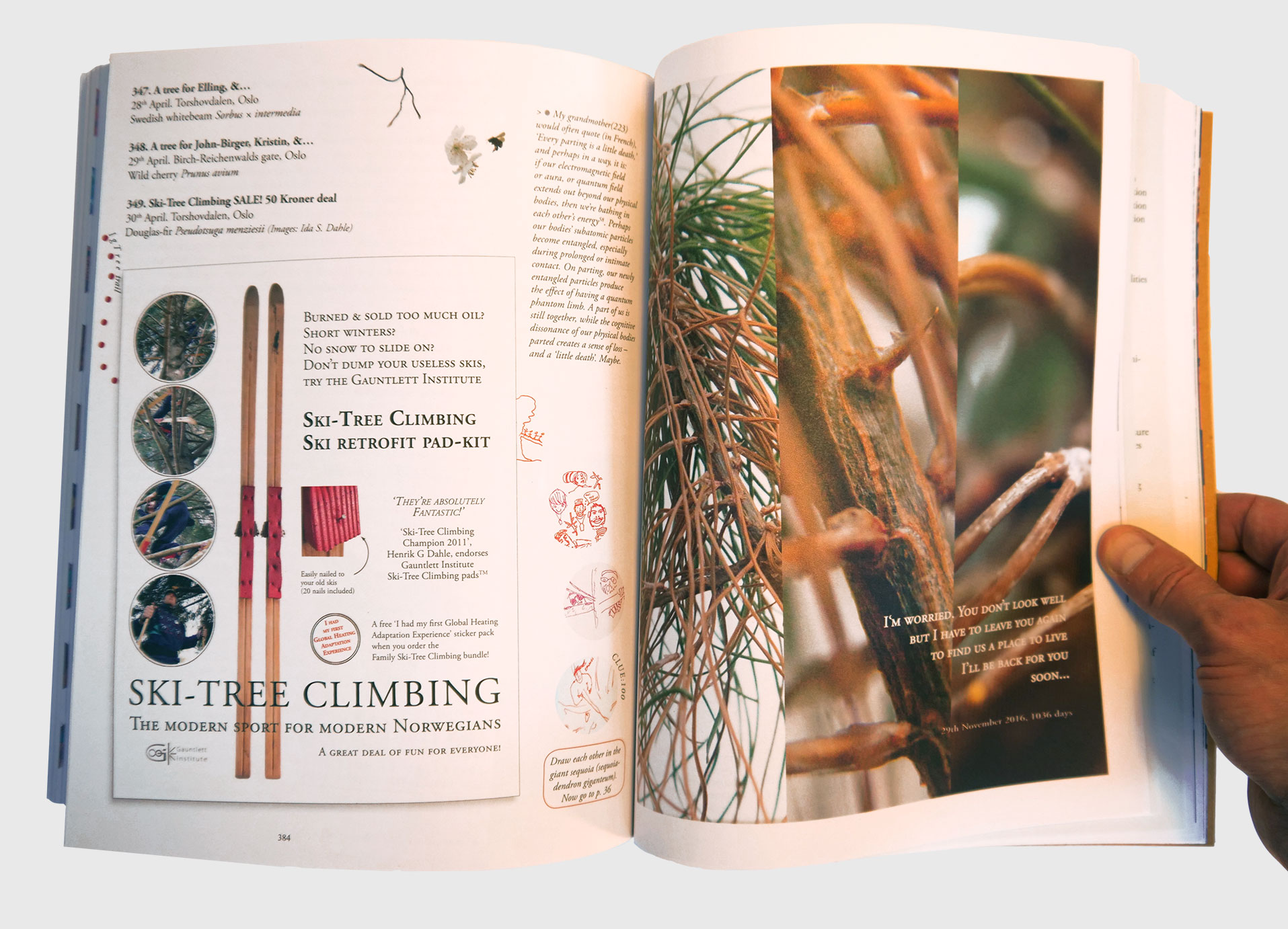 A book based on the diary I kept while climbing 365 trees. A walkabout through four seasons, around 10 countries, and a daily playful appointment with extra/ordinary trees. I was joined by eighty ‘co-climbers’ โ€“ professors, children, artists, economists, activists….. whimsical and weighty conversations โ€“ ultimately aiming to understand how we can break the cycle of violence and exploitation once and for all; to create an achievable eutopia.