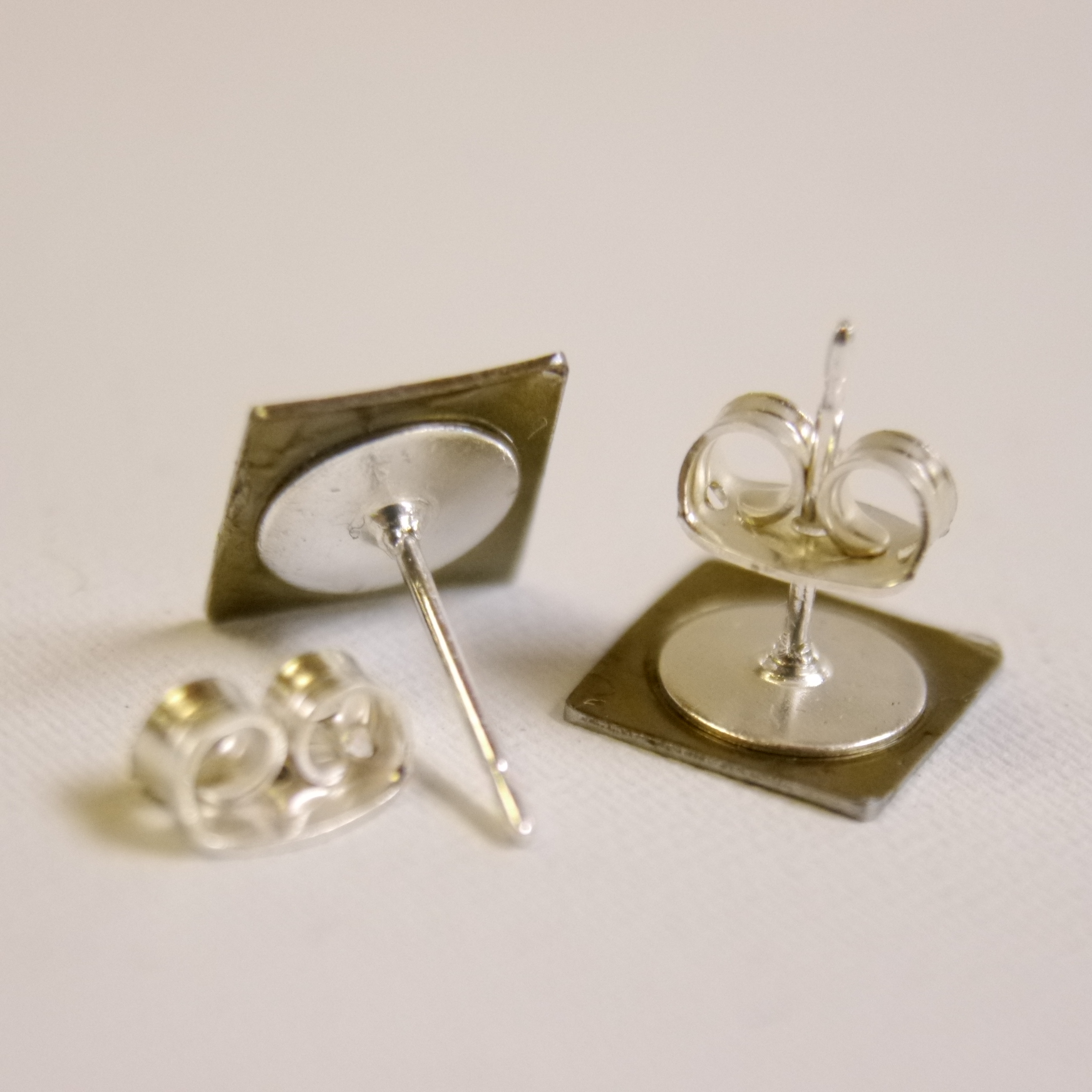 Pieces are mounted on sterling silver-plated studs. The backs are given two coats of Jewelry Shield lacquer to guard against allergy.